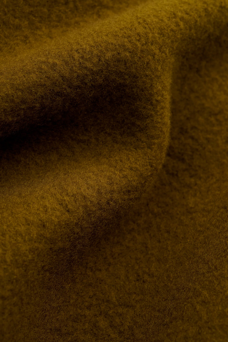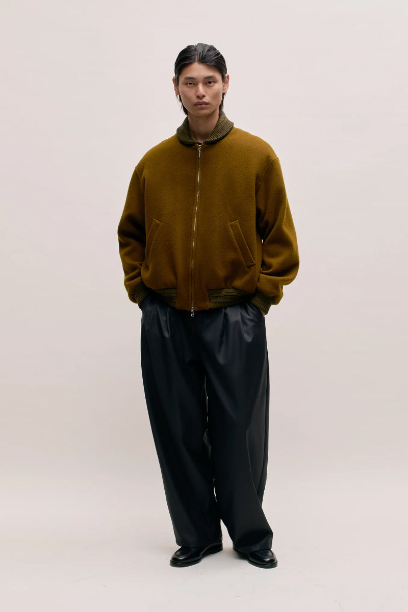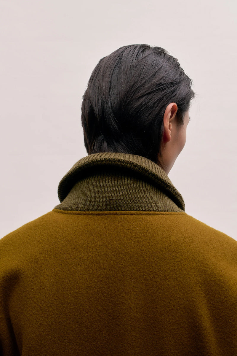 Crafted from a virgin wool and cashmere blend, the fabric offers a soft, brushed finish, delivering substantial warmth with a smooth, structured drape. This bomber is expertly designed for cool-weather versatility.