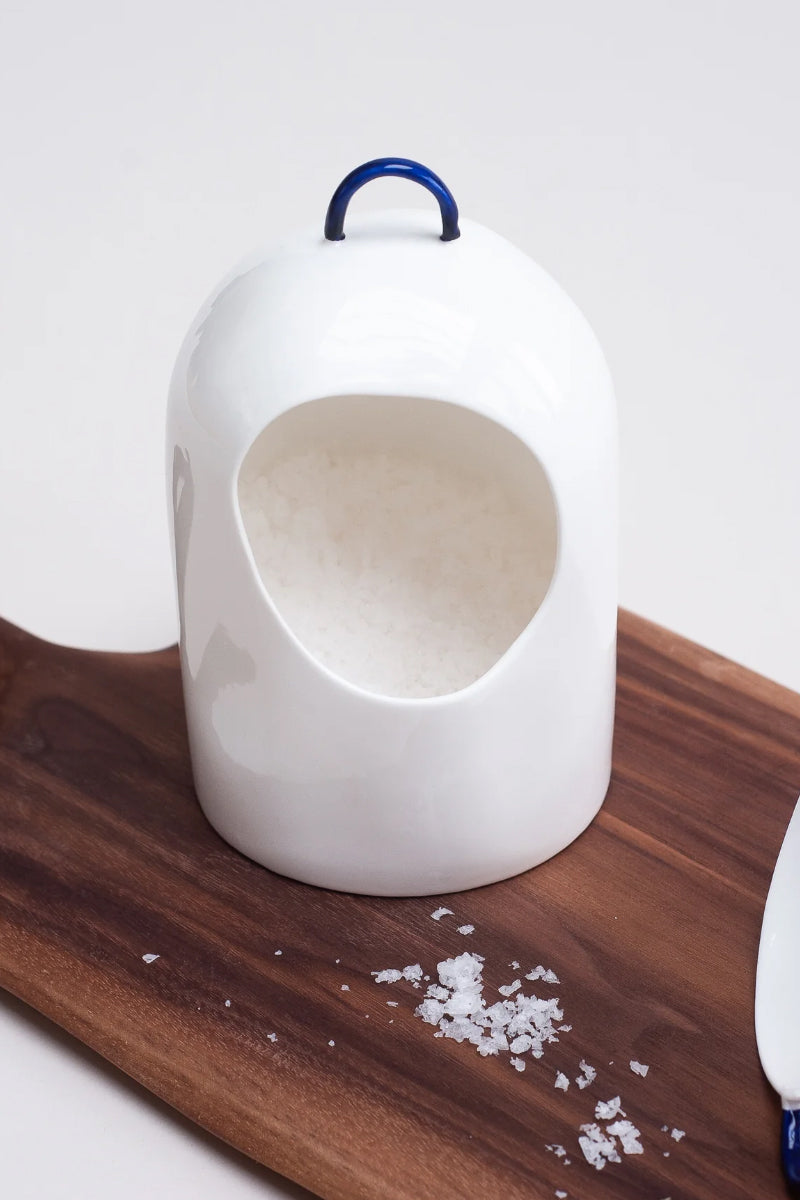 A masterfully designed Salt Pig that marries form with function. Constructed from premium fine bone china with a protective glaze, it preserves your cooking salt in pristine condition whilst maintaining convenient access at the stovetop. The hand-painted cobalt blue loop handle provides intuitive handling, and the ergonomic hand-cut opening ensures a secure, comfortable grip. An understated yet indispensable addition to any serious cook's kitchen.