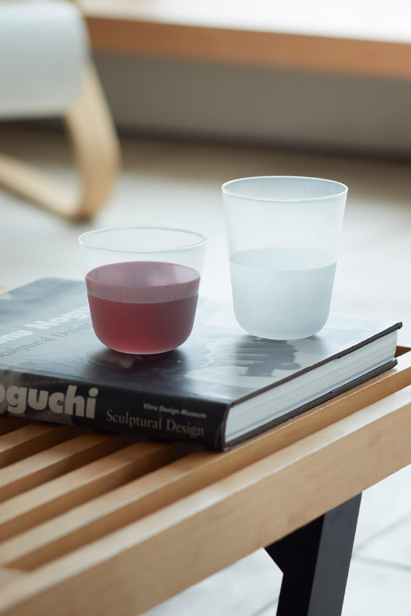 These elegant tumblers feature a distinctive two-tone design with a polished upper section and matte lower half, creating visual depth and tactile interest. The gently curved base and tapered silhouette make them equally suited to wine, water, or spirit-based drinks. Crafted from durable soda-lime glass, they offer exceptional clarity while withstanding daily use. The matte finish on the lower portion provides a sophisticated contrast and improved grip. This versatile pair brings understated refinement to any table setting.