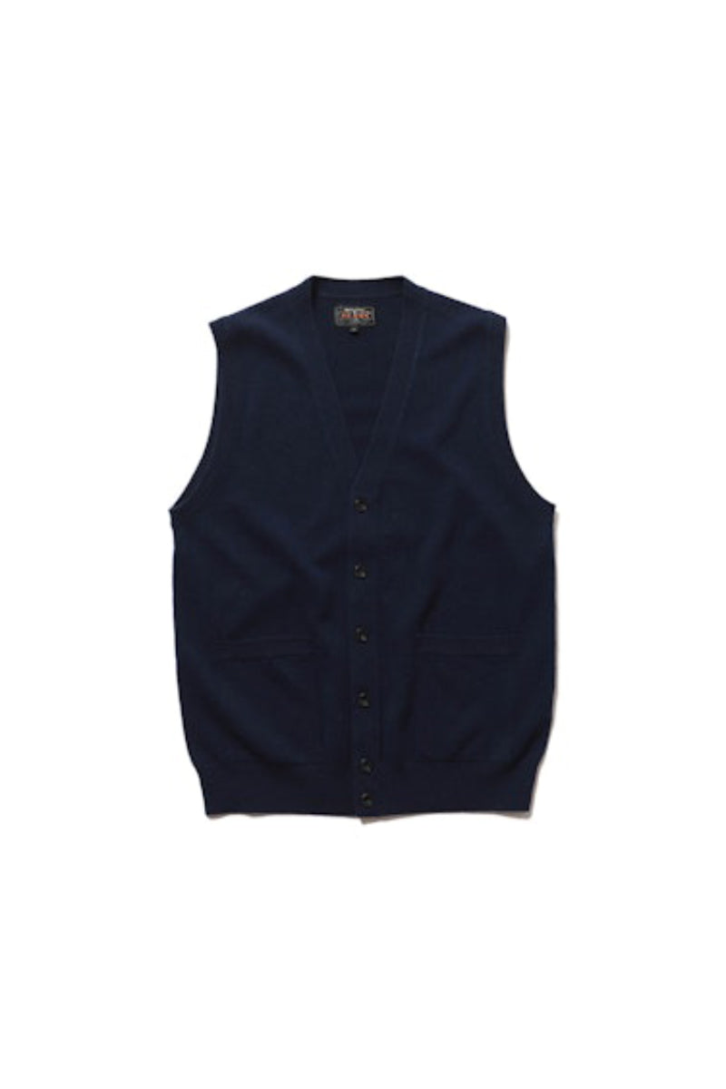 The Beams Plus button fly knit vest features a timeless, straightforward design that remains endlessly wearable. It includes small, practical pockets on both sides of the front. A grosgrain tape reinforces the back of the placket to maintain its shape over time. With a classic pattern that complements jackets and shirts, its slightly shorter length makes it ideal for layering. Crafted from fine 12-gauge, 100% Australian extra fine merino wool, the vest offers a soft, smooth feel and a rich, lustrous finish achieved through yarn-dyeing.