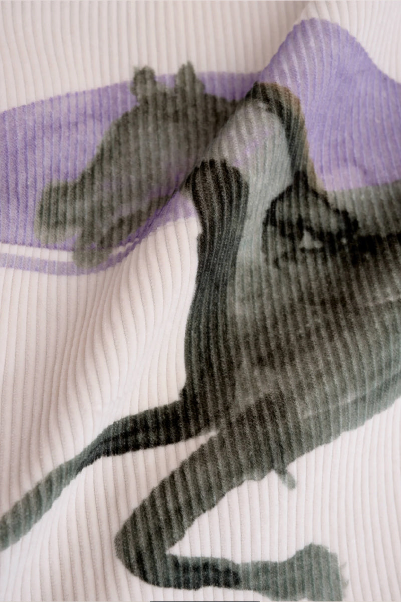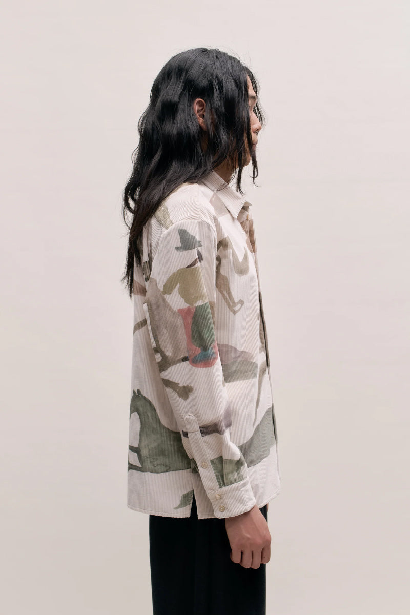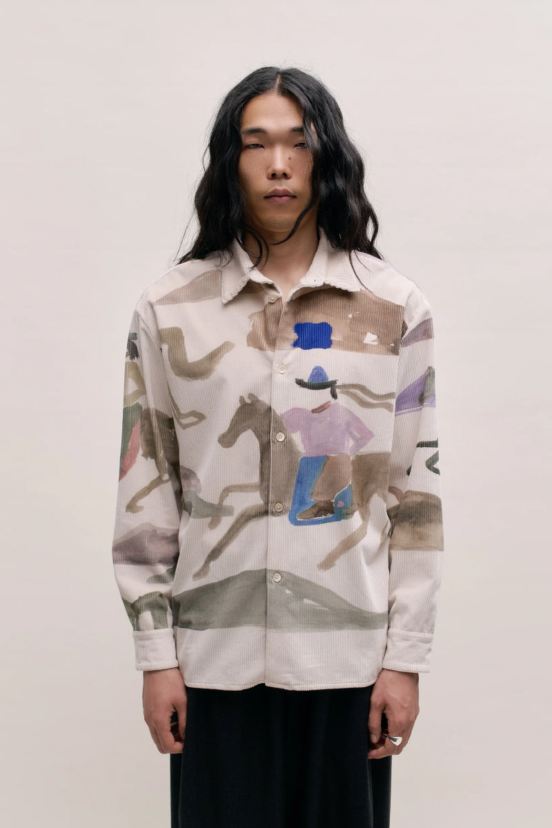 The Derbin Shirt – Running Horses presents a relaxed oversized silhouette with a classic collar and a straight hem equipped with side vents for unrestricted movement. A rear pleat provides added comfort and a structured finish. Drawing inspiration from the acclaimed Gusto Shirt, it merges casual ease with precise tailoring, making it a versatile wardrobe staple. Crafted from soft cotton corduroy, the fabric showcases a print by Berlin artist Jonathan Niclaus, illustrating a serene horseback scene inspired by Mongolian riders. The earthy hues and textured background create a sense of depth and expansive freedom.