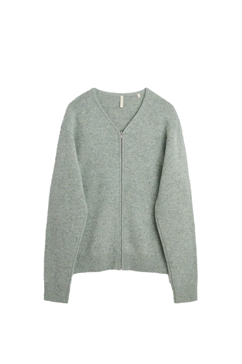This zip-up cardigan is crafted from vibrant Donegal yarn and features a silver zipper leading into a V-neck. It has a tailored fit at the cuffs and hem, made entirely from 100% fine Merino wool.