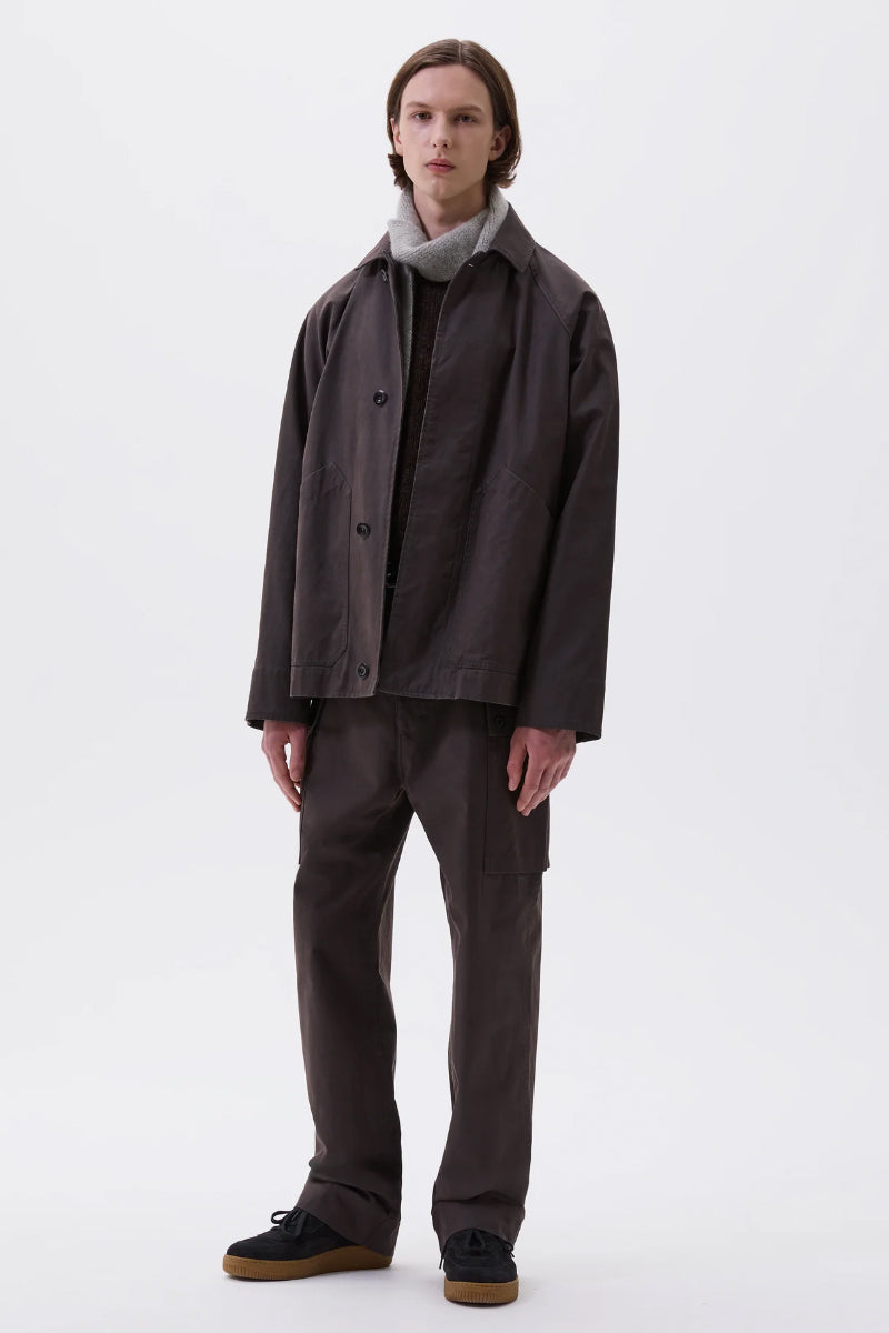The MHL Raglan Jacket features a relaxed fit crafted from dense cotton drill with a subtly brushed texture, available in exclusive MHL shades. Drawing inspiration from vintage factory jackets, it includes a button fly front, angled patch pockets, and a split panel on the back yoke. Finished with corozo brace buttons, this jacket is made in Portugal from 100% cotton and is machine washable for easy care.