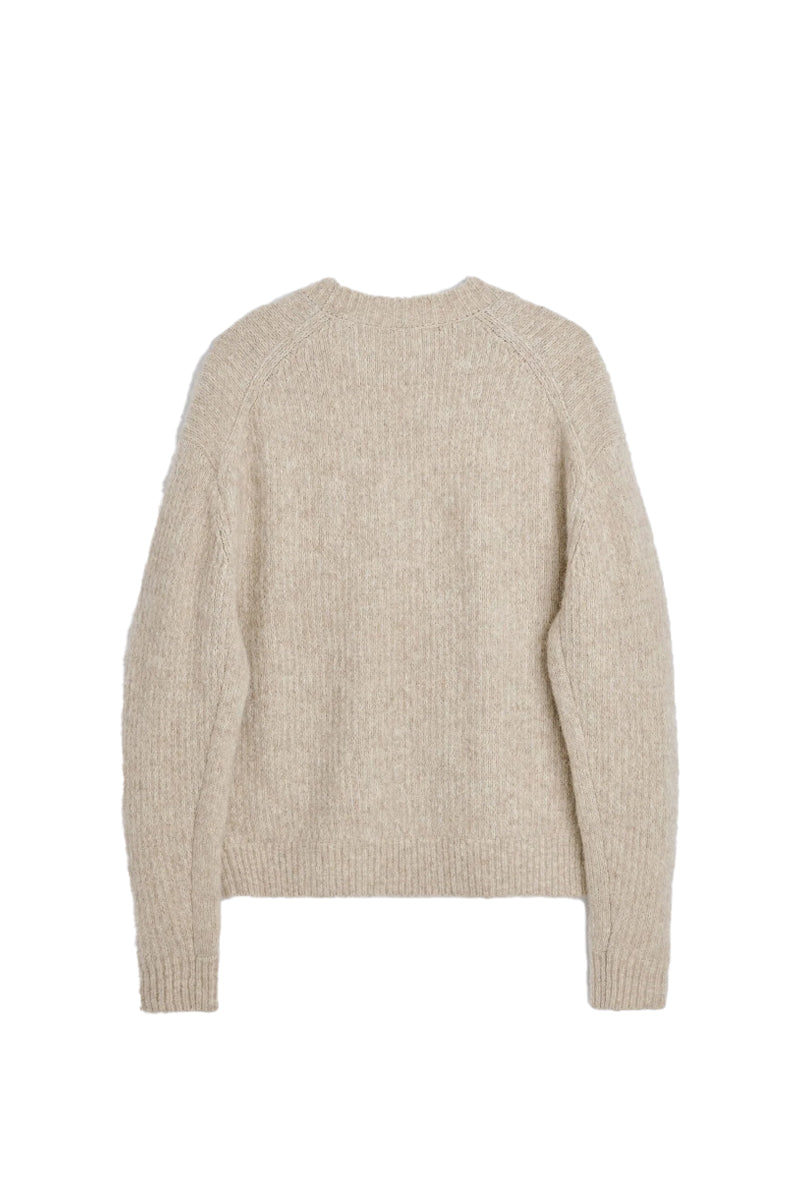 This beige crew neck sweater features subtly dropped shoulders and is constructed with a 5gg brushed rib knit. The enhanced collar adds a polished touch, while its yarn blend of 31% yak, 31% alpaca, 16% RWS Extrafine merino wool, and 22% recycled nylon ensures a lightweight and soft feel.