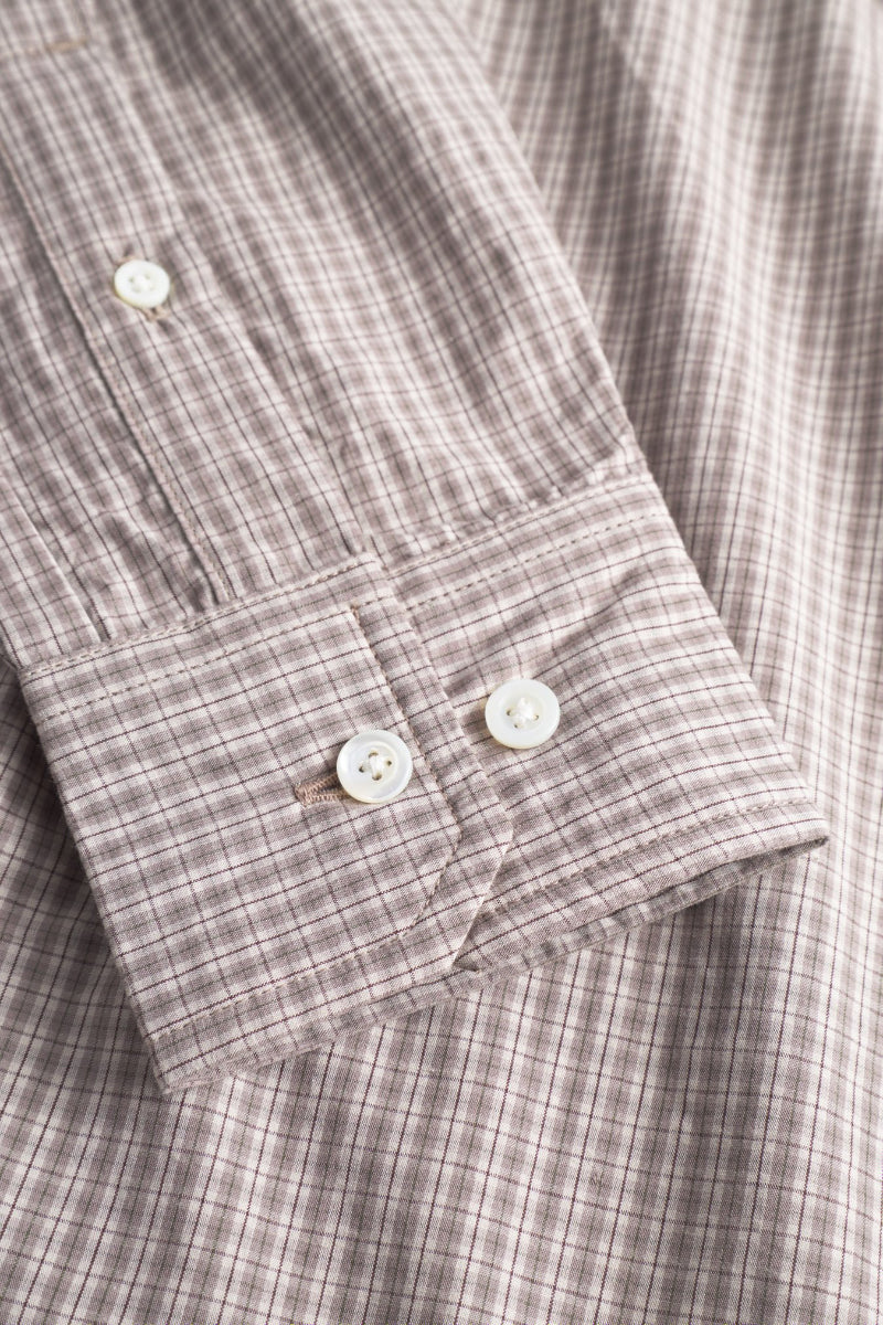 This shirt offers an oversised silhouette with a broader cut, crafted from lightweight cotton poplin that has been washed to achieve a relaxed, soft texture. It showcases a yarn-dyed check pattern, complete with a chest pocket, a box pleat on the back, a contoured hem, and mother-of-pearl buttons for refined detail.