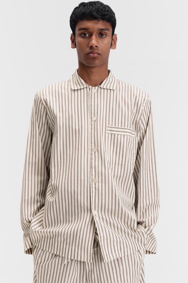 Crafted from premium 122 GSM poplin, these pyjamas feature an intentionally relaxed silhouette enhanced by refined French seaming. The design includes a rounded collar, extended sleeves, and a functional chest pocket, while mother of pearl buttons provide an understated luxury touch. Ideal for those who appreciate quality construction and timeless comfort.