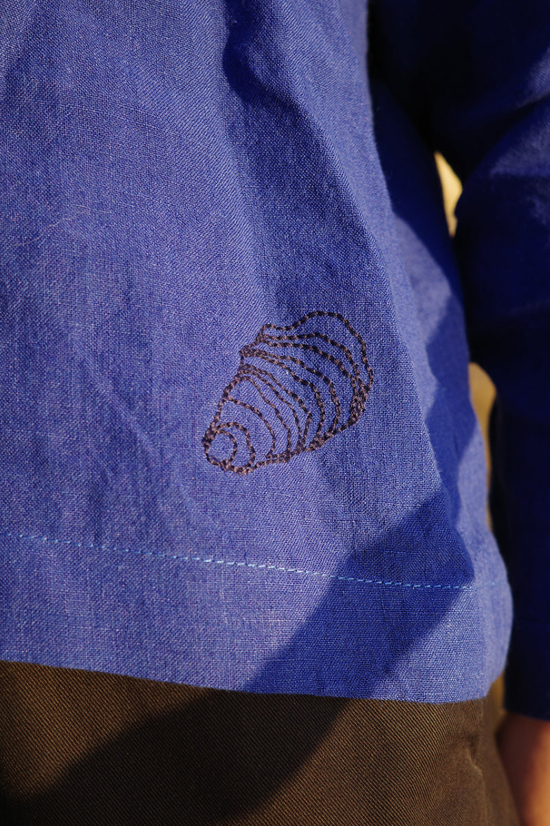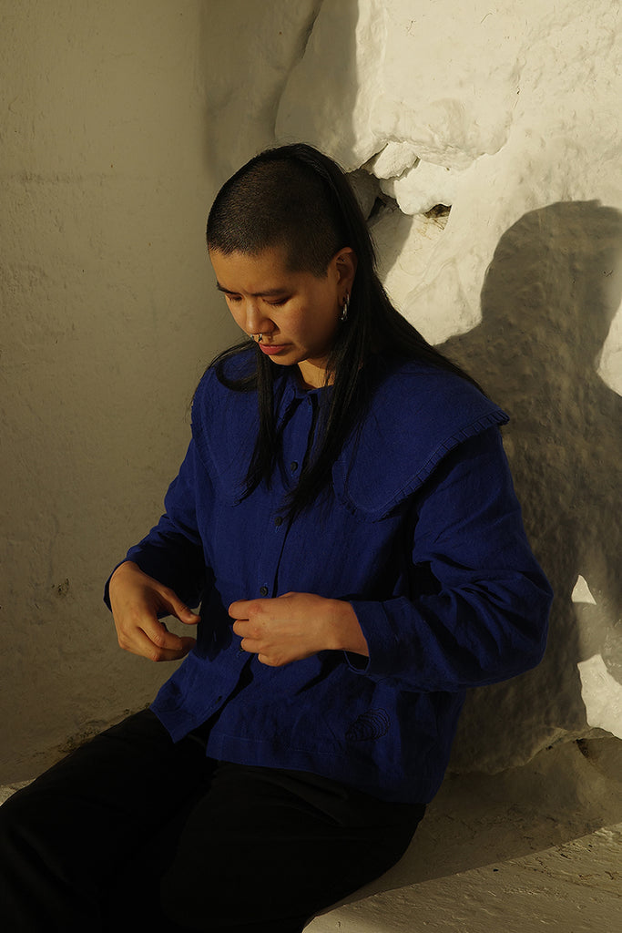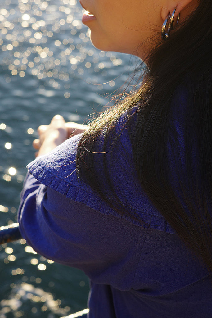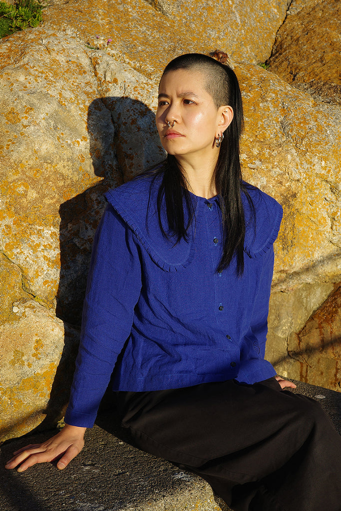 Made in collaboration with Dublin based designer, Jennifer Slattery, this Ella Oversized Collar Top is a signature piece with a unique collar embellished with pleats. Made from a custom cobalt blue, high-quality tumble washed Irish linen. Finished with an oyster shell embroidery detail.
